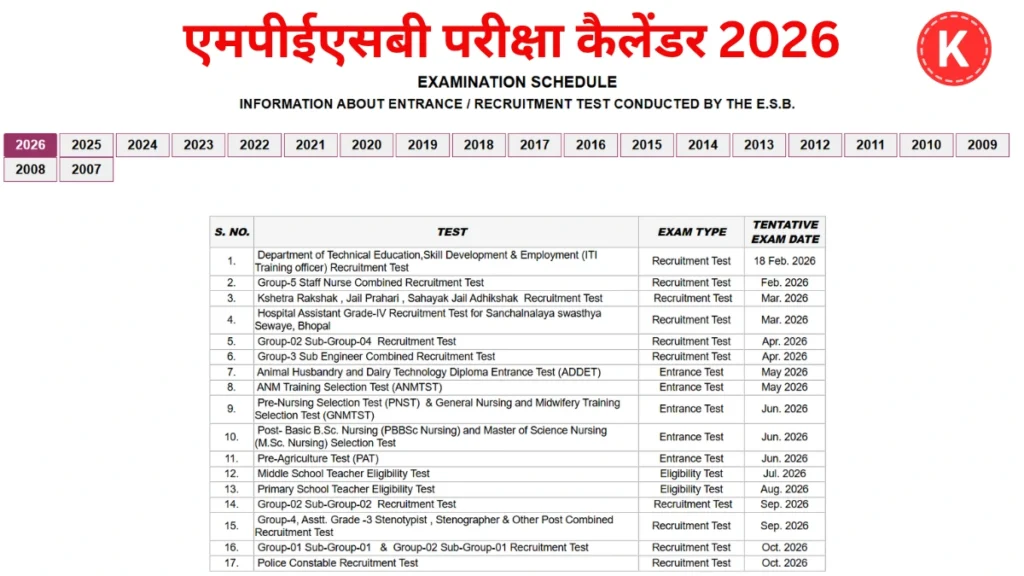 एमपीईएसबी परीक्षा कैलेंडर 2026 – MPESB Exam Calendar 2026 | यहाँ देखें फरवरी से अक्टूबर तक होने वाली 21 बड़ी परीक्षाओं का पूरा शेड्यूल मध्य प्रदेश कर्मचारी चयन बोर्ड (एमपीईएसबी) ने सरकारी नौकरी