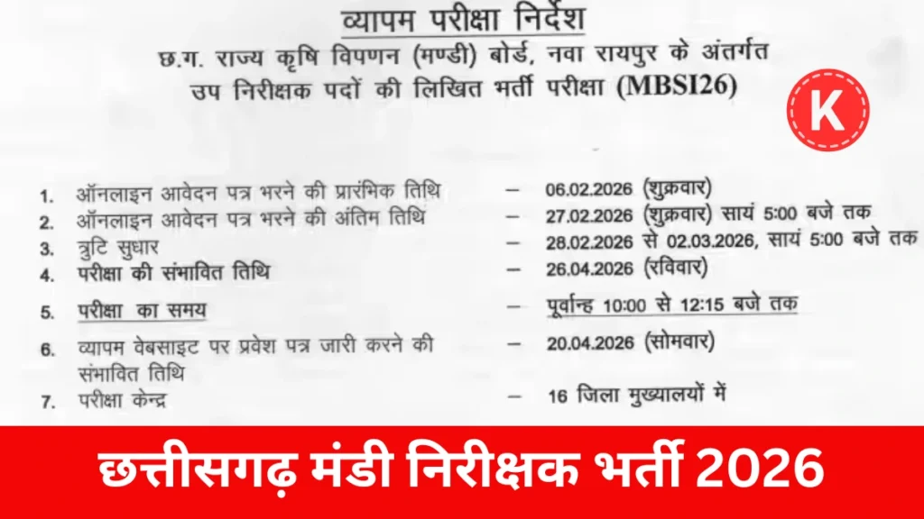 छत्तीसगढ़ सरकार ने मंडी निरीक्षक भर्ती 2026 के लिए अधिसूचना जारी की है। यह भर्ती राज्य के विभिन्न जिलों में