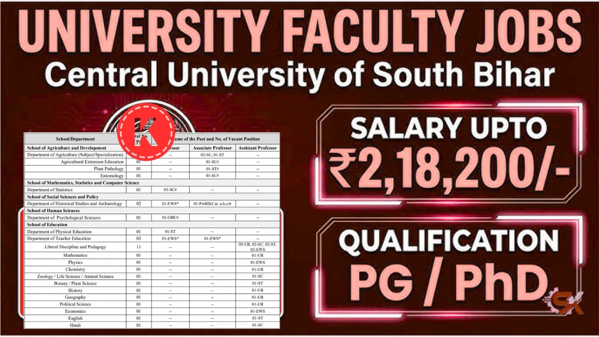 केंद्रीय दक्षिण बिहार विश्वविद्यालय (सीयूएसबी), गया ने शैक्षणिक सत्र के लिए फैकल्टी पदों पर भर्ती के लिए आधिकारिक अधिसूचना जारी कर दी है। CUSB फैकल्टी भर्ती 2026 के तहत प्रोफेसर, एसोसिएट प्रोफेसर और असिस्टेंट प्रोफेसर के कुल 35 रिक्त पदों को भरा जाएगा। यह भर्ती विश्वविद्यालय के विभिन्न स्कूलों और विभागों में की जाएगी। इच्छुक और योग्य उम्मीदवार 3 मार्च से 30 मार्च 2026 के बीच ‘सीयू चयन पोर्टल’ के माध्यम से ऑनलाइन आवेदन कर सकते हैं।
