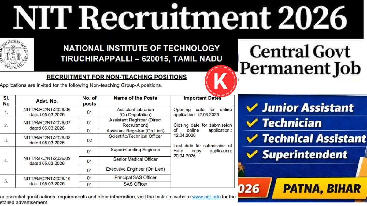 यह नेशनल इंस्टीट्यूट ऑफ टेक्नोलॉजी द्वारा जारी की गई भर्ती है, जिसमें विभिन्न नॉन-टीचिंग पदों पर उम्मीदवारों की नियुक्ति की जाती है।