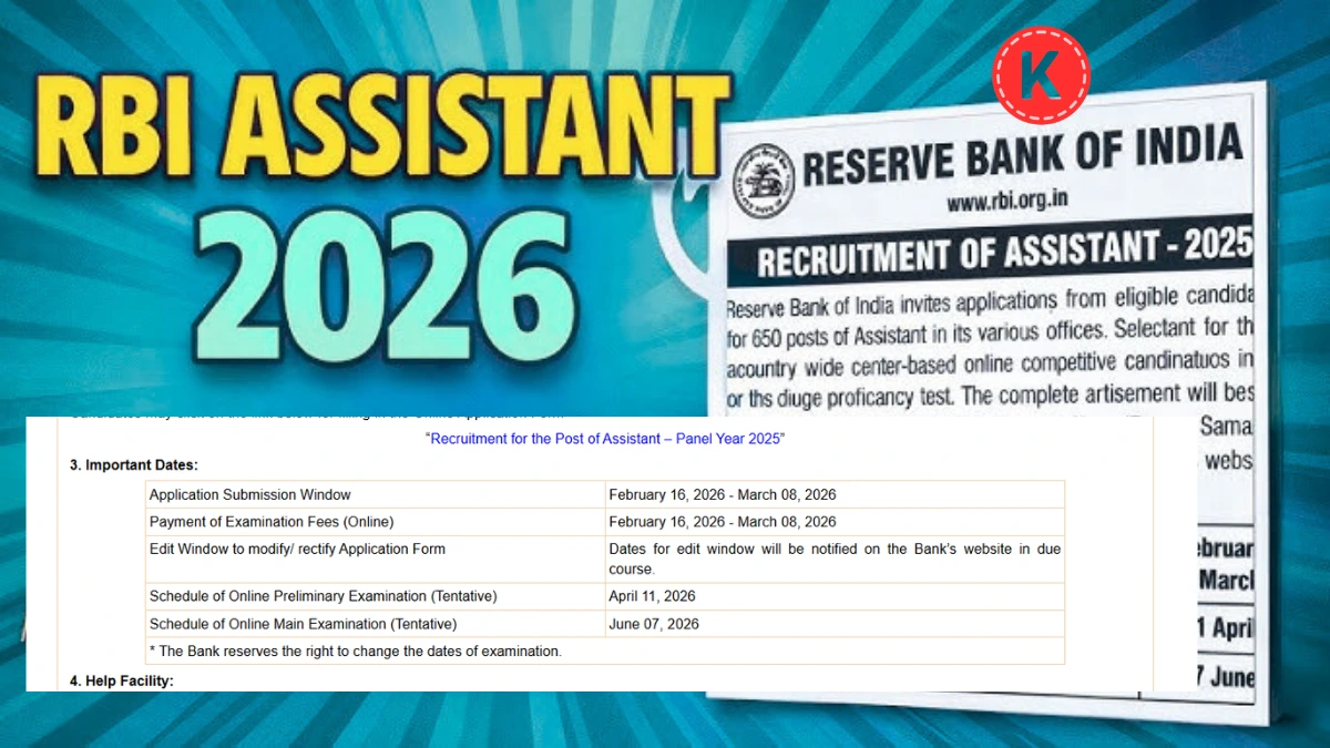 भारतीय रिज़र्व बैंक (RBI) ने RBI Assistant Notification 2026 आधिकारिक रूप से 16 फरवरी 2026 को जारी किया। इस भर्ती के तहत देशभर में 650 Assistant पदों के लिए आवेदन आमंत्रित किए गए हैं। इच्छुक उम्मीदवार जिनकी आयु 20 से 28 वर्ष के बीच है और जिनके पास किसी भी विषय में स्नातक की डिग्री है, वे 8 मार्च 2026 तक ऑनलाइन आवेदन कर सकते हैं।